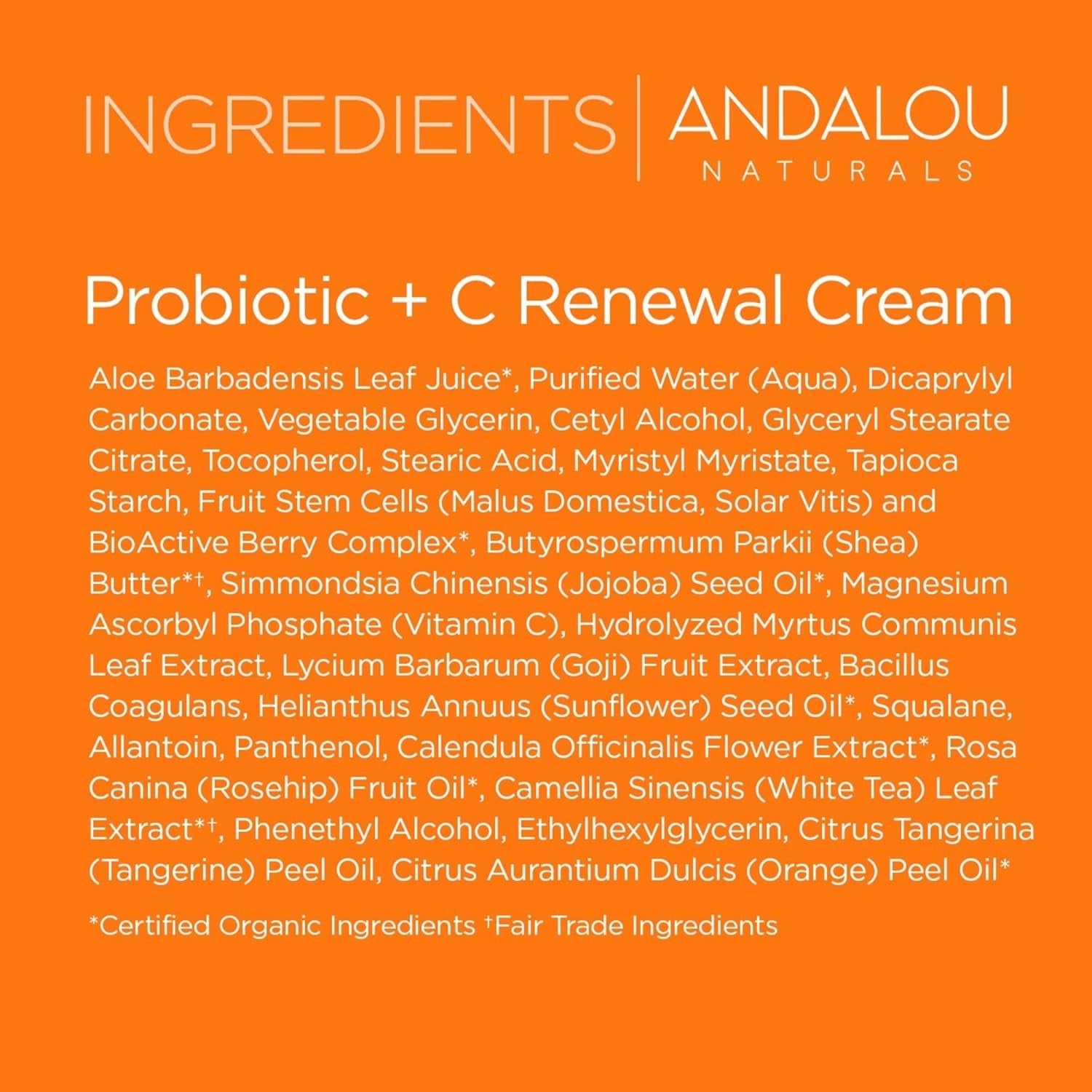 - FOR NORMAL & COMBINATION SKIN Probiotics in Andalou Naturals' Probiotic + C Renewal Cream help support skin health and vitality, while fruit stem cells and vitamin C help give skin a brighter, toned, and balanced appearance with a healthy looking glow.