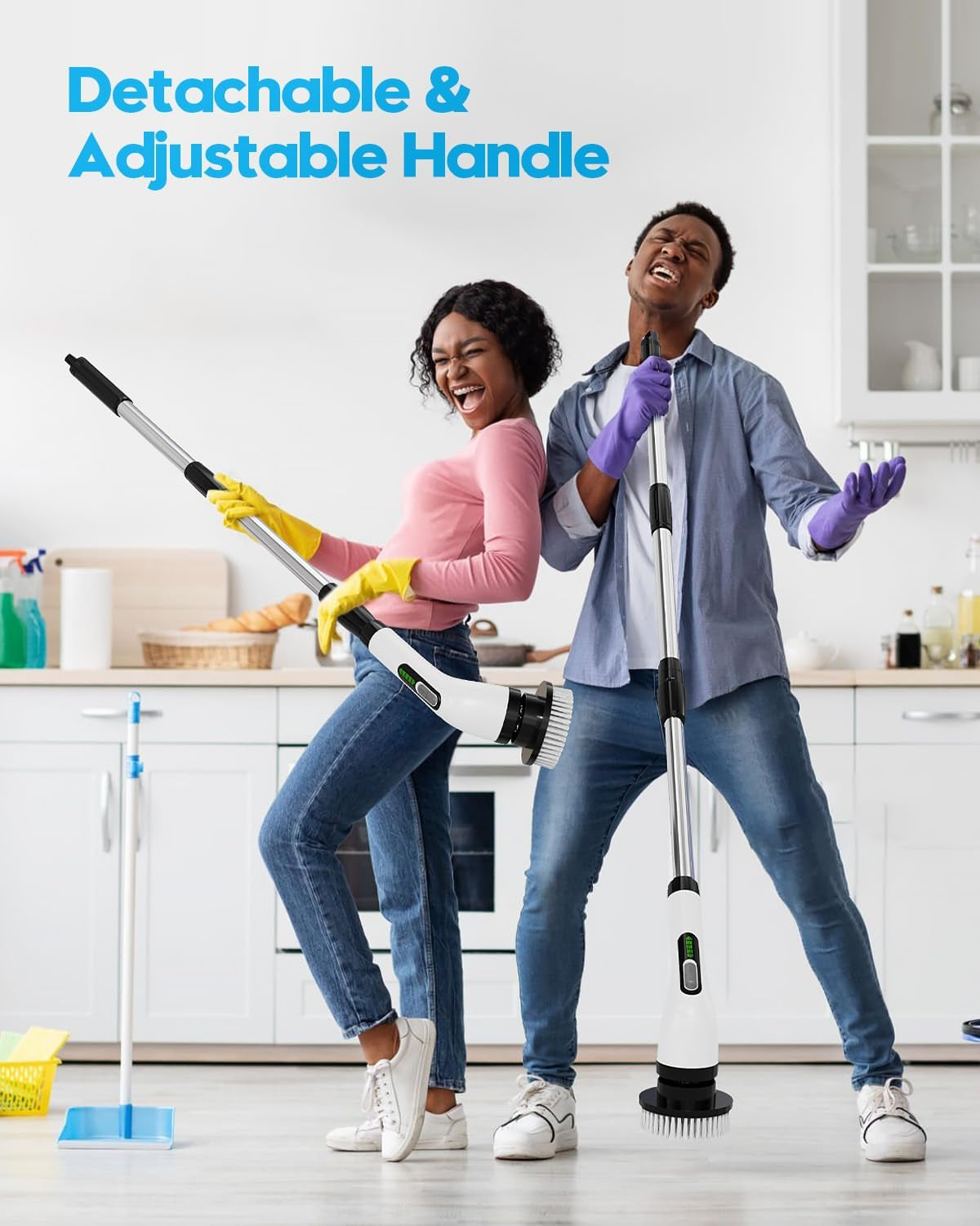 - 【3 - Adjustable Length】This electric scrubber for cleaning offers 3 adjustable lengths (12in/43in/54in) using metal - latched extension rods. The ergonomic anti - slip grip fits all hands, and the reinforced joint eliminates wobbling. Clean high ceilings or low grout without bending—ideal as a shower scrubber with long handle or bathroom cleaning brush.