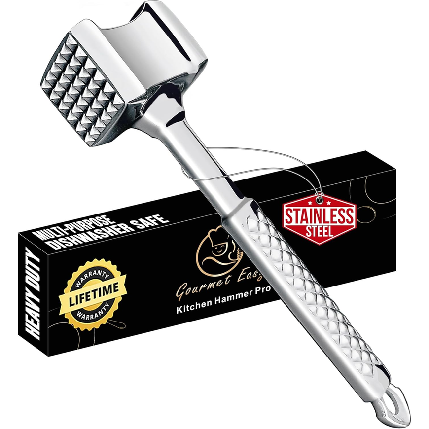 The Gourmet Easy Stainless Steel Meat Tenderizer is a dual-sided mallet designed for efficient food preparation. The flat side ensures even pounding for cutlets, while the textured side softens tougher cuts of meat. Made from durable 304 stainless steel, it features a non-slip handle for a secure grip and is dishwasher safe for easy cleaning. This versatile tool can also be used to crush nuts, crack shells, or break ice, making it a practical addition to any kitchen.