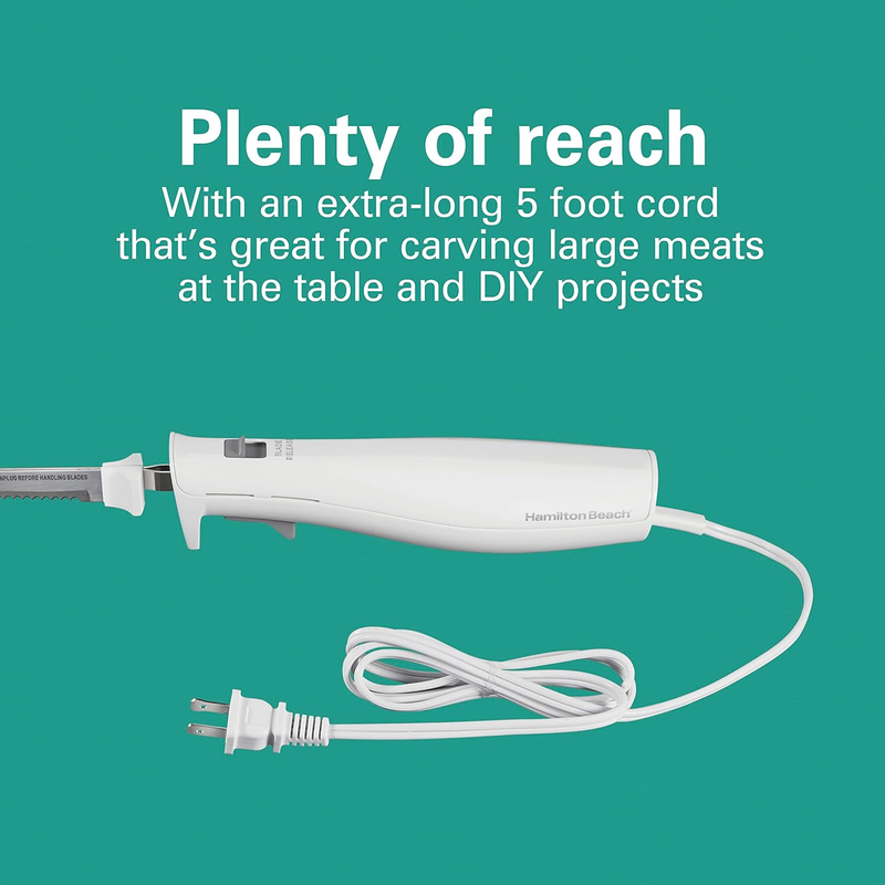 The Hamilton Beach Electric Knife Set features reciprocating serrated stainless steel blades designed to carve meats, poultry, bread, and more with precision. Powered by a 120-watt motor, this lightweight electric knife offers controlled, even slicing with an ergonomic handle for comfortable use. Ideal for both kitchen tasks and crafting, the set includes a stainless steel carving fork and a compact storage case for organised safekeeping. The 5-foot cord offers extended reach for flexible use at the table or workspace.