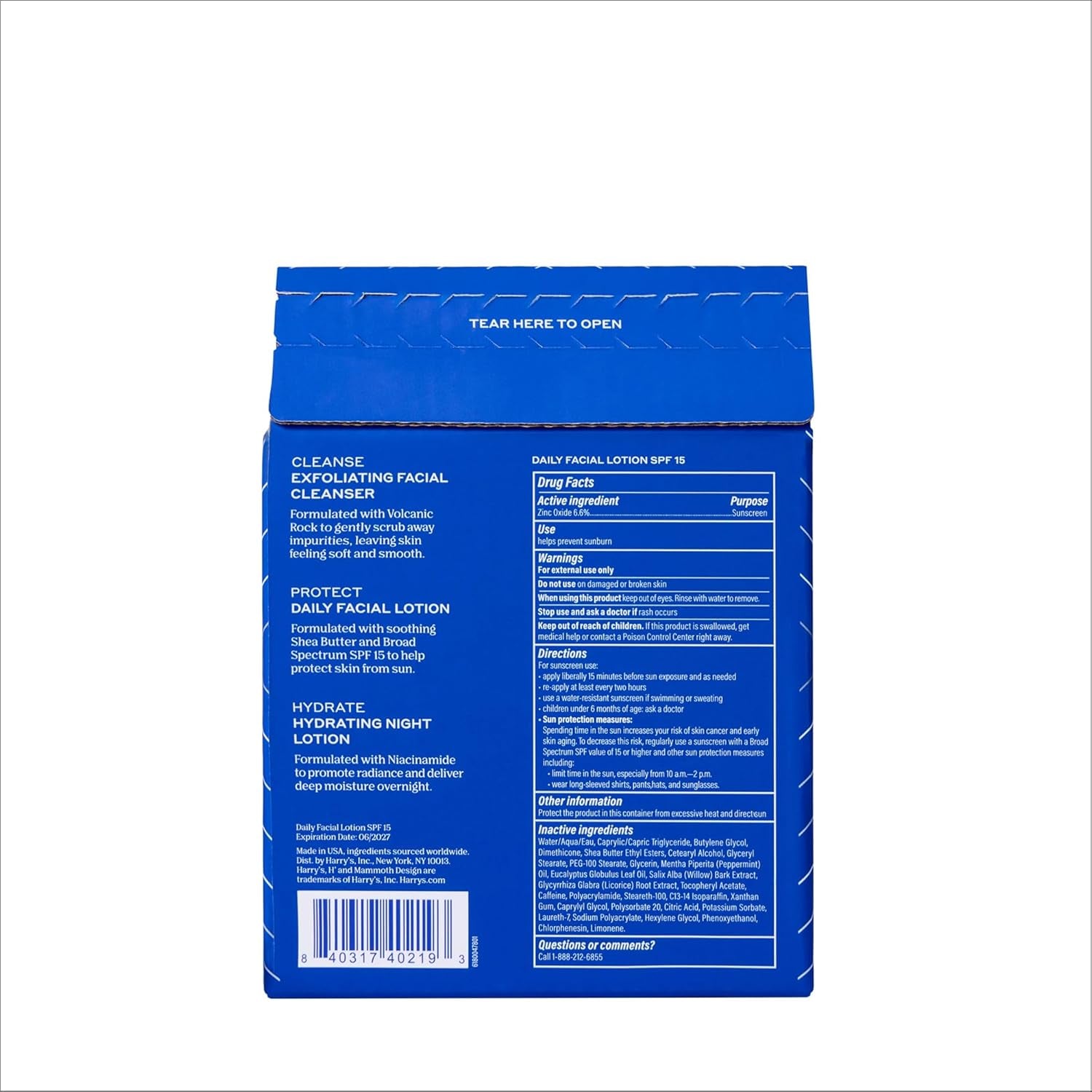 Harry's Exfoliating Face Wash: Formulated with volcanic rock, an exfoliant that leaves skin texture feeling soft and smooth, and invigorating scents of Eucalyptus and Peppermint to wake you up in the morning. Harry's Daily Facial Lotion SPF 15: Formulated with soothing Shea Butter and subtle Mint for a light, fresh scent Harry's Hydraing Night Lotion: Formulated with Niacinamide to promote radiance and deliver deep moisture overnight