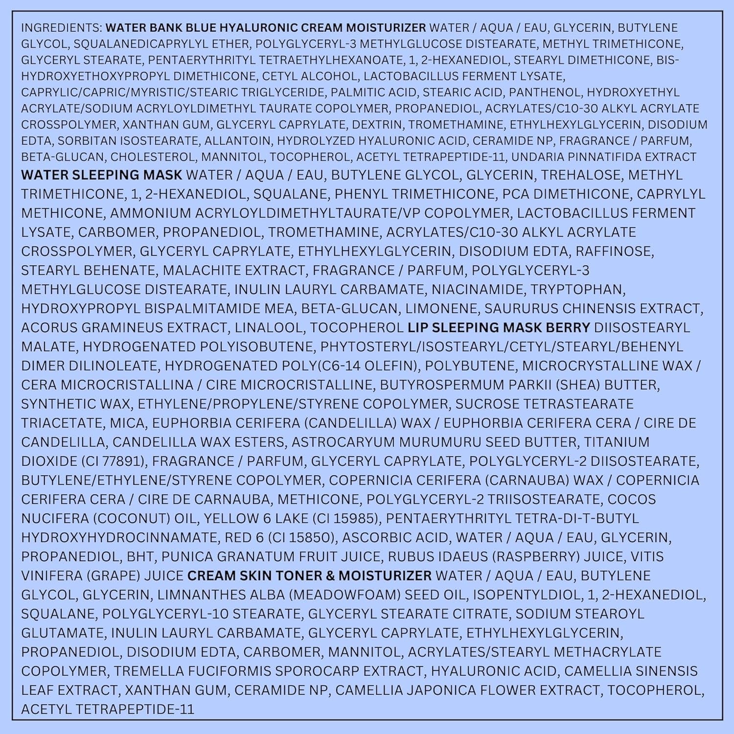 - Discover the best of LANEIGE in this limited-edition set featuring four must-have minis: Cream Skin Toner & Moisturizer, Water Bank Blue Hyaluronic Cream Moisturizer, Water Sleeping Mask, and Lip Sleeping Mask in Berry for the ultimate Korean skincare routine.