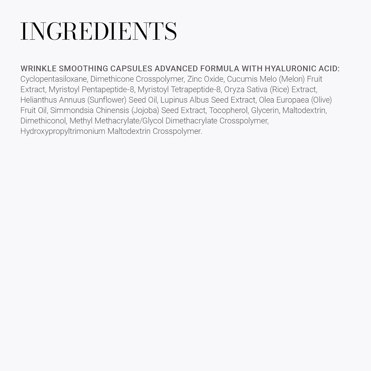 Ingredients:Cyclopentasiloxane, Dimethicone Crosspolymer, Zinc Oxide, Cucumis Melo (Melon) Fruit Extract, Myristoyl Pentapeptide-8, Myristoyl Tetrapeptide-8, Oryza Sativa (Rice) Extract, Helianthus Annuus (Sunflower) Seed Oil, Lupinus Albus Seed Extract, Olea Europaea (Olive) Fruit Oil, Simmondsia Chinensis (Jojoba) Seed Extract, Tocopherol, Glycerin, Dimethiconol, Methyl Methacrylate/Glycol Dimethacrylate Crosspolymer, Hydroxypropyltrimonium Maltodextrin Crosspolymer.How to use - Gently open capsules by twisting off the small nodule. Apply contents topically to those areas with fine lines and wrinkles. Can be used to target specific areas like the nasolabial folds, eleven lines and crow’s feet. May also be used all over the face using light, upward strokes. Can be used alone or with makeup.