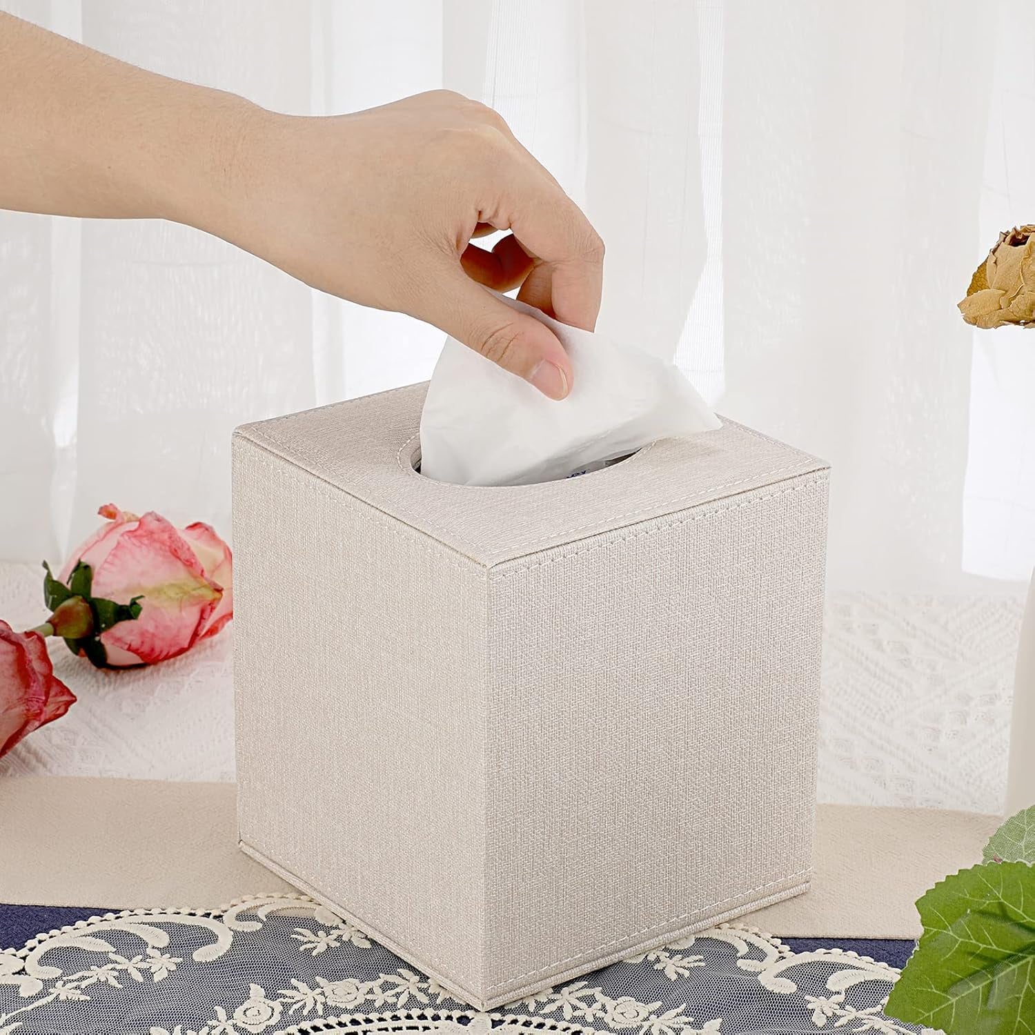 - The attractive square tissue box cover is made of high quality MDF(inside) + Linen (outside) materials; It's sturdy to keep the tissue box from being crushed; The stitching is not only even and neat, but also contrasts nicely with the beige linen material.
