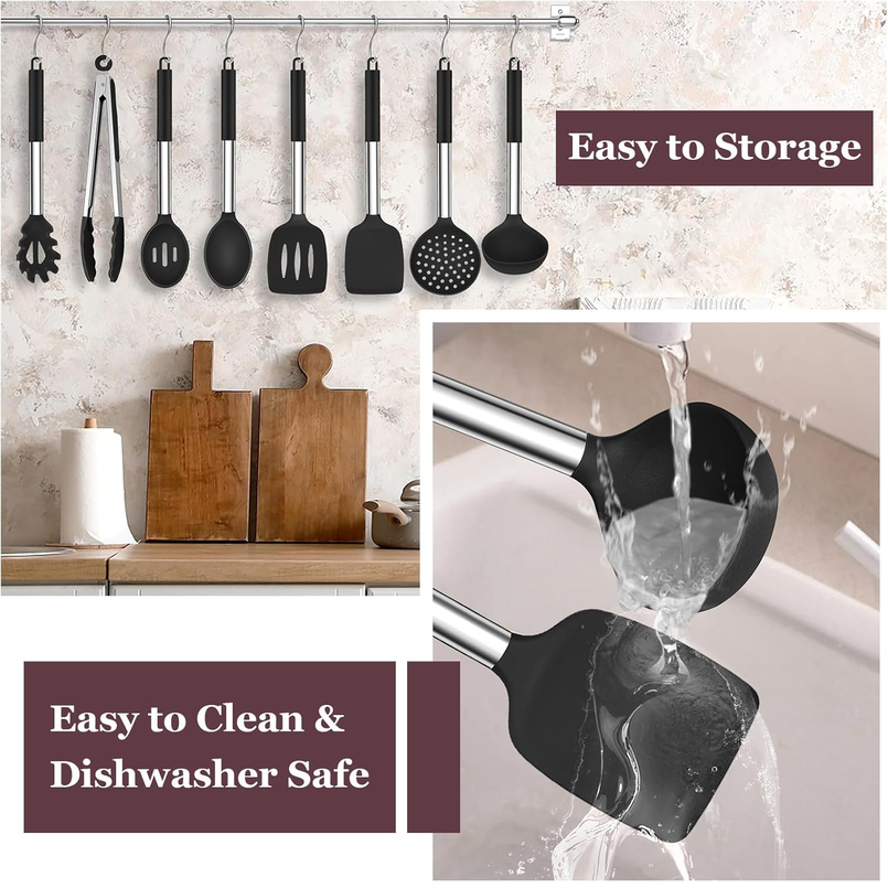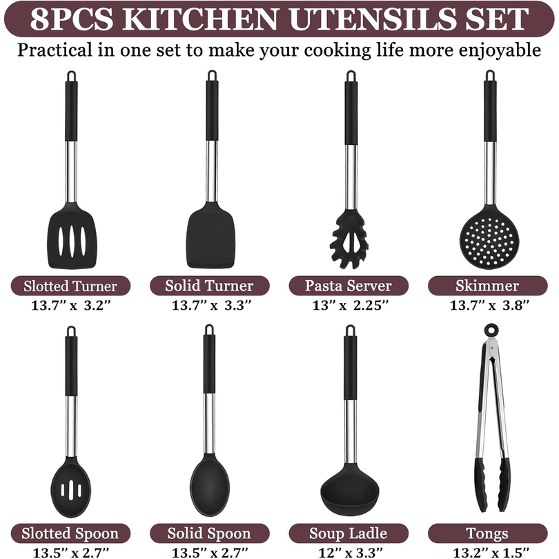 TeamFar 8-Piece Silicone Kitchen Utensil Set with Stainless Steel Handles – Black