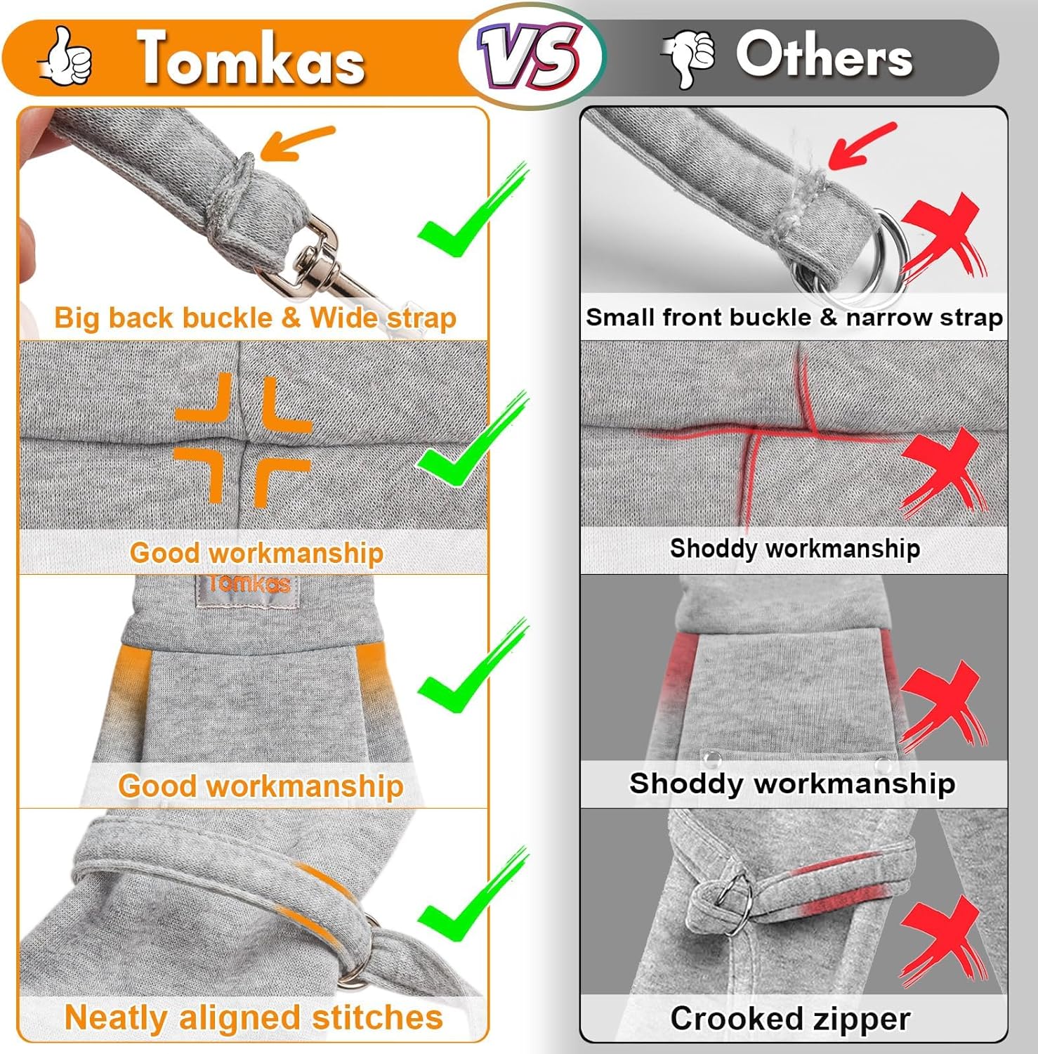 - Premium Materials And Design: The TOMKAS puppy carrier is made from selected fabric. The fabric is thick enough to ensure softness and reassure furry children.Hardware and snaps are durable.TOMKAS dog carrier has a large opening that can easily put pets in it.You can move the safety belt to change the bag's capacity, and press on the snaps to help close the opening.The sutures are tough, well-made and not prone to cracking. TOMKAS dog bags are great chihuahua and Yorkshire accessories.